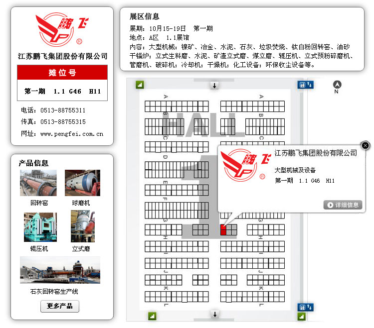 江蘇鵬飛集團在廣交會上精心布置展位,印發(fā)各類設備的介紹手冊,整體模型展示水泥生產(chǎn)線產(chǎn)品,委派具有多年工作經(jīng)驗的銷售、技術、售后等專業(yè)人員為顧客詳細介紹新產(chǎn)品、新技術,全面分析解答各類設備從購買到投產(chǎn)使用以及售后服務等每個環(huán)節(jié)的問題,為您排疑解難,與您達成共識。同時,也希望能和更多的國內(nèi)外公司加強聯(lián)系,互相合作,為客戶提供更加完美的產(chǎn)品。