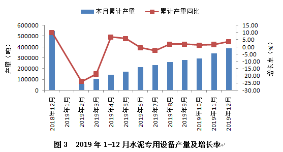從行業(yè)重點監(jiān)測的產品看,水泥專用設備產量實現小幅增長,2019年累計完成38.65萬噸,同比增長3.69%,較上年同期下降6.37個百分點。從全年產量增速變化趨勢看(見圖3),上半年波動較大,下半年逐步趨緩、趨穩(wěn)。