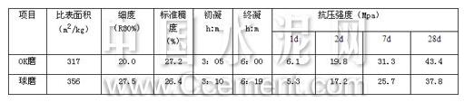 表中數(shù)據(jù)說明:在凝結(jié)時間、標準稠度需水量基本相同的前提下,OK磨磨制的水泥28d抗壓強度比球磨水泥高出15%,同時,水泥的早期強度也高,可進一步增加混合材摻量,降低水泥生產(chǎn)成本。