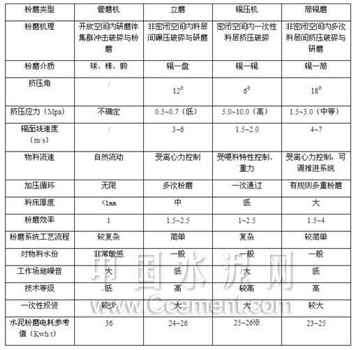 表1 管磨機與立磨、輥壓機、筒輥磨粉磨特性對比