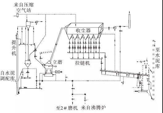 生產(chǎn)P·O42.5水泥時工藝流程是:熟料、石膏、石灰石、粉煤灰、礦渣等物料經(jīng)輸送設(shè)備輸送至各配料倉,粉煤灰從粉煤灰?guī)煜陆?jīng)輸送設(shè)備進入生產(chǎn)系統(tǒng)。各種物料按一定比例設(shè)定,分別經(jīng)各定量給料機和輸送設(shè)備送至入磨鎖風(fēng)閥后入磨。入磨物料在磨內(nèi)進行烘干和粉磨,粉磨后的物料經(jīng)選粉機分離,粗粉返回磨盤重新粉磨,合格細粉隨氣流直接進入袋式收塵器進行收集,收集下來的成品經(jīng)空氣斜槽、斗式提升機等輸送設(shè)備入水泥庫儲存;立磨吐渣經(jīng)輸送設(shè)備(設(shè)有除鐵器)進入循環(huán)斗式提升機,提升入磨后繼續(xù)粉磨。沸騰爐提供的熱風(fēng)與循環(huán)風(fēng)、冷風(fēng)混合后進入磨內(nèi),磨內(nèi)混合風(fēng)起到烘干和提升物料的作用,出磨氣流進入布袋收塵器;出布袋收塵器的氣體經(jīng)循環(huán)風(fēng)機后一部分經(jīng)循環(huán)風(fēng)管,作為循環(huán)風(fēng)入磨,其余氣體經(jīng)煙囪排入大氣。系統(tǒng)工藝流程見圖1。