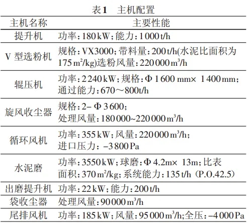 此系統(tǒng)主要由 V 型選粉機(jī)、輥壓機(jī)、旋風(fēng)收塵器和球磨機(jī)組成。球磨機(jī)系統(tǒng)為開流系統(tǒng),輥壓機(jī)系統(tǒng)放風(fēng)與球磨機(jī)通風(fēng)共用一套收塵系統(tǒng)。流程見圖1,主機(jī)配置見表 1。