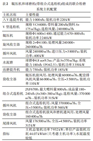 此系統(tǒng)主要由 V 型選粉機(jī)、輥壓機(jī)、旋風(fēng)收塵器、球磨機(jī)和組合式選粉機(jī)組成,球磨機(jī)系統(tǒng)為閉路系統(tǒng),流程圖見圖 3,主要的主機(jī)配置見表 2。其中輥壓機(jī)系統(tǒng)設(shè)有單獨(dú)放風(fēng)系統(tǒng),球磨機(jī)單獨(dú)通風(fēng)與組合式選粉機(jī)放風(fēng)共用一套收塵系統(tǒng)。