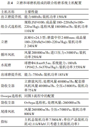 此系統(tǒng)主要由立磨、組合式選粉機(jī)、球磨機(jī)和O-Sepa 選粉機(jī)組成,球磨機(jī)系統(tǒng)為閉路系統(tǒng),流程圖見圖 5,主要的主機(jī)配置見表 4。